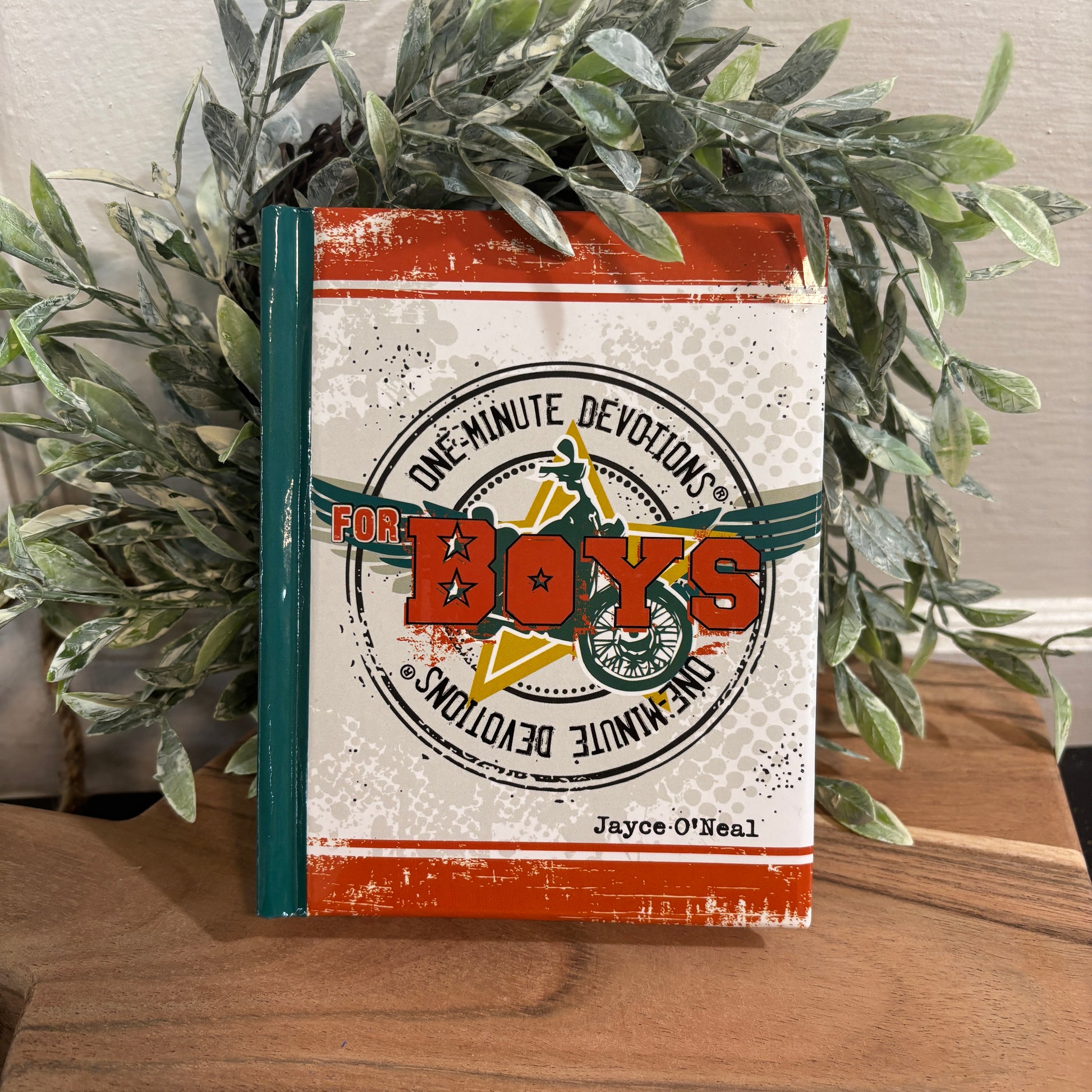 The devotional features a fun racing bike design in bright red and blue hues. The covers are padded, the front cover features a teal racing bike design, and the title is presented in a rounded medallion design.