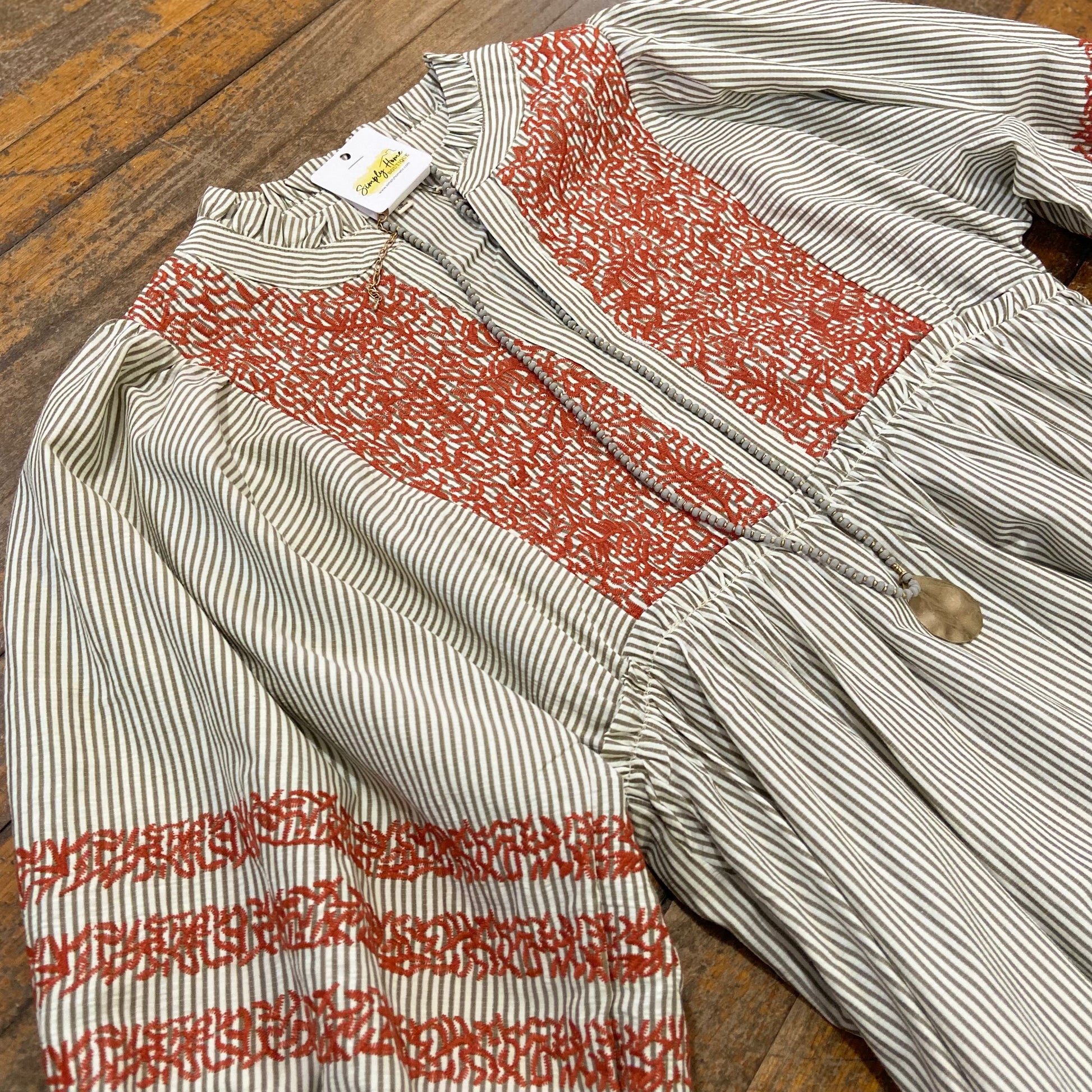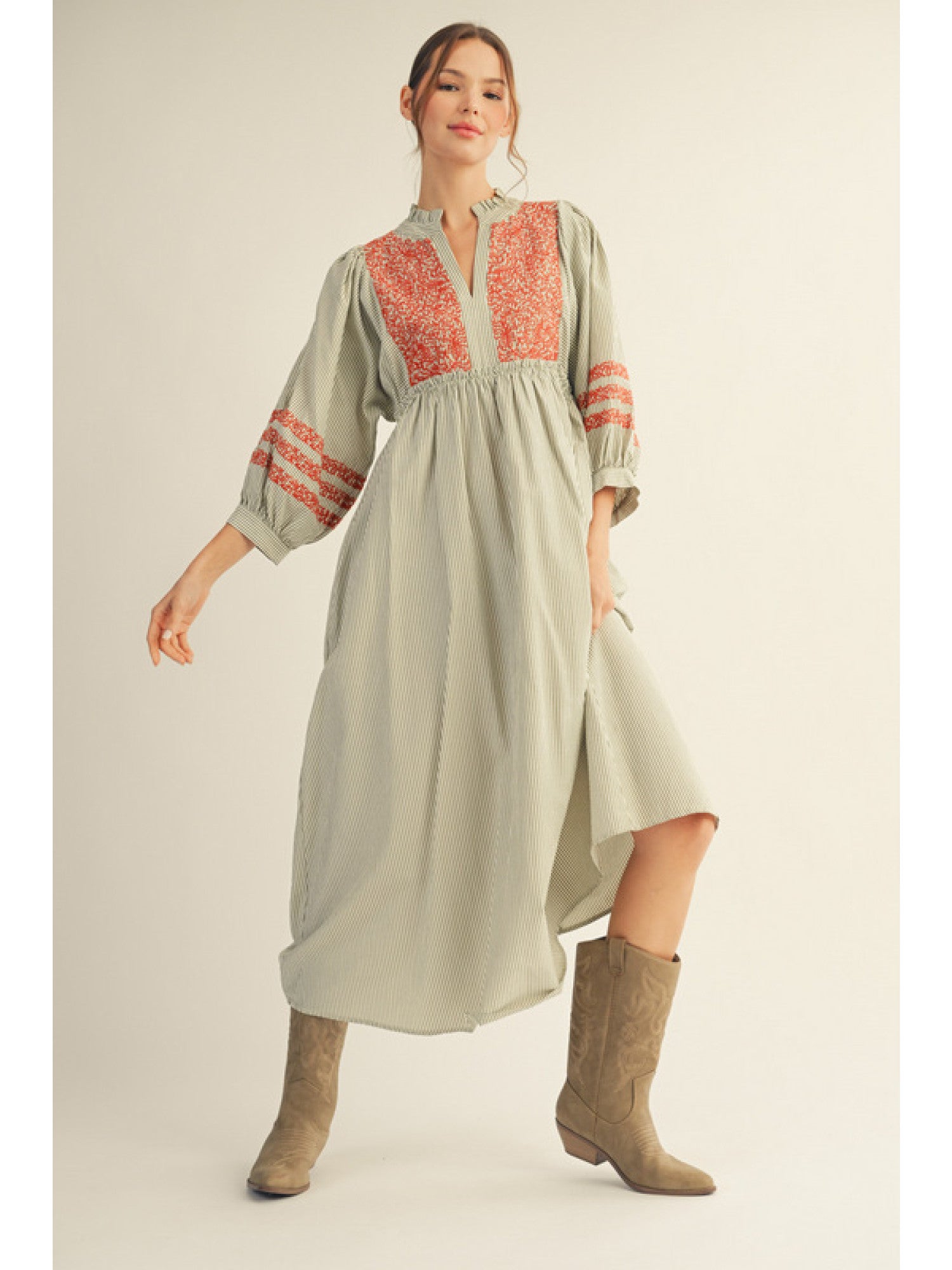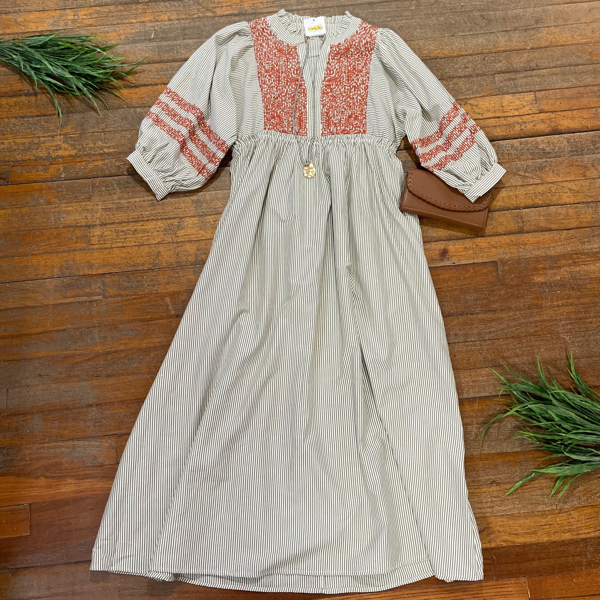 3/4 Puff Sleeve, Stripe Midi, Embroidery Detail