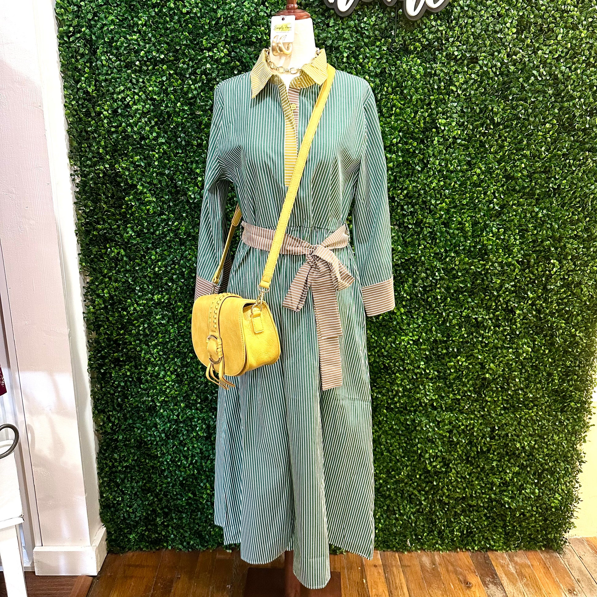 3/4 sleeves stripe fabric mix midi dress with side pockets, front button up, multi color stripe fabric mix match, collared neckline, waist tie detail.