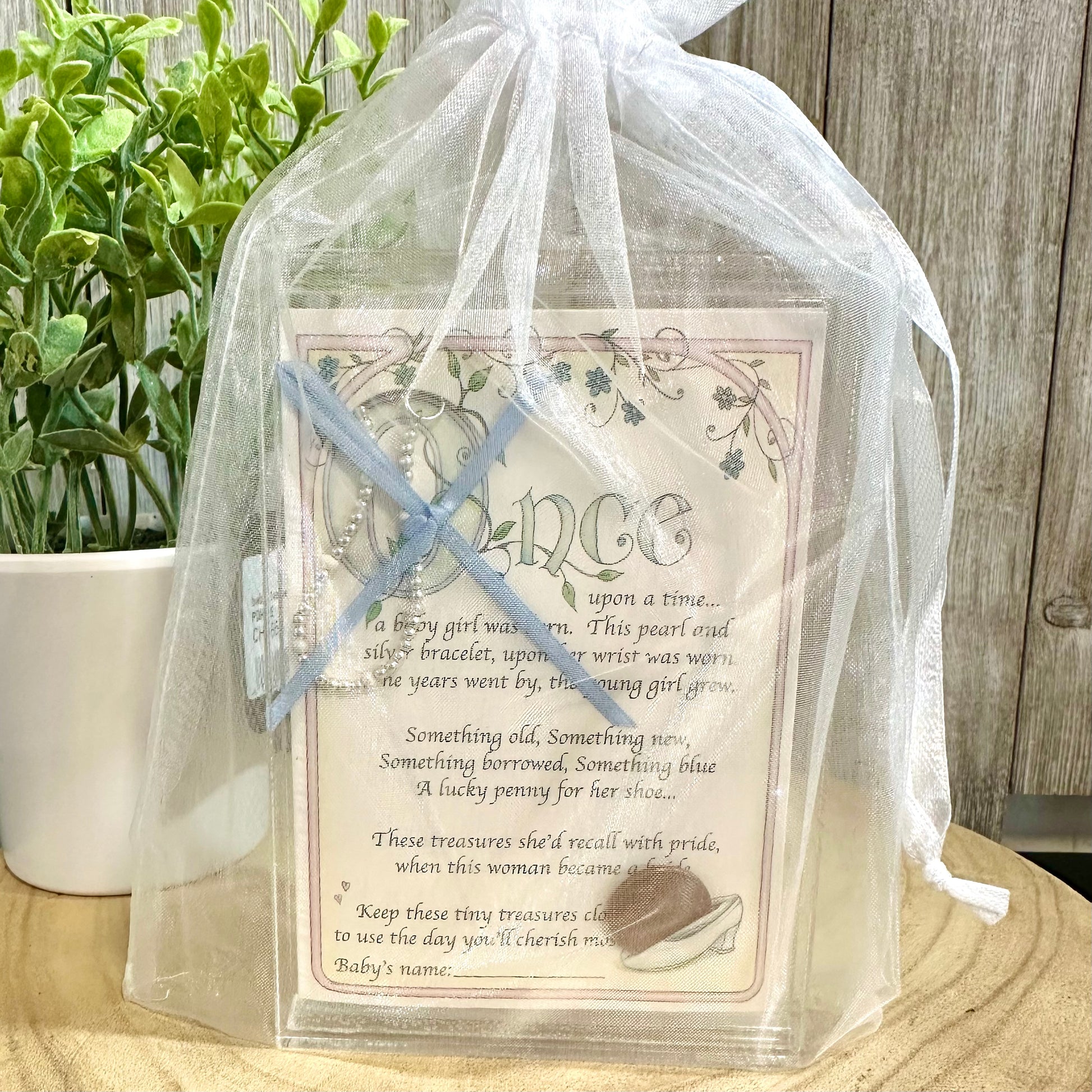 Frame comes with a sterling silver bracelet with pearls and a lucky penny. It is intended for the bracelet to be used when the girl is a baby and the lucky penny is to put in her shoe when she becomes a bride. It comes with a beautiful poem and instructions on the back. It's a perfect way to celebrate a girl’s christening.