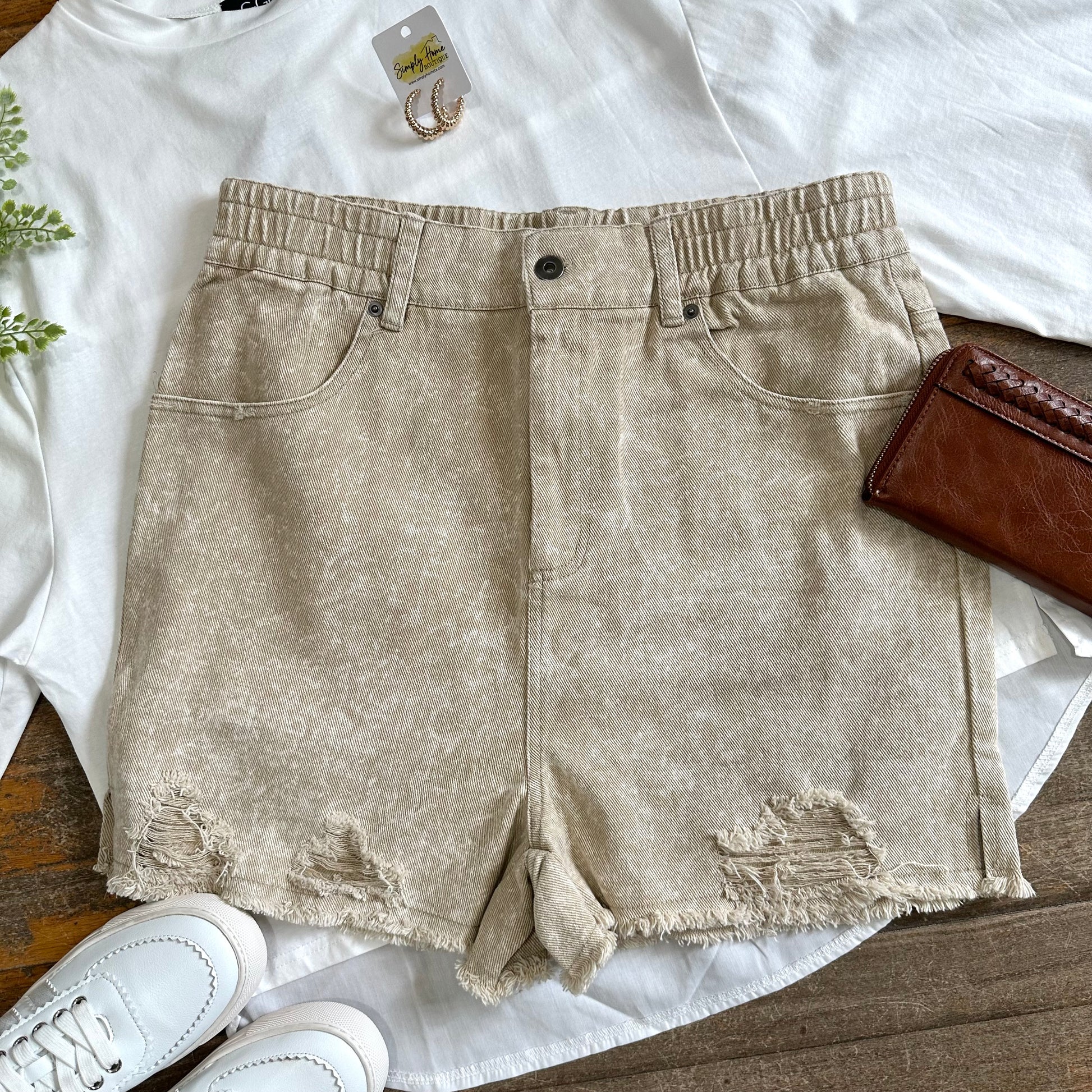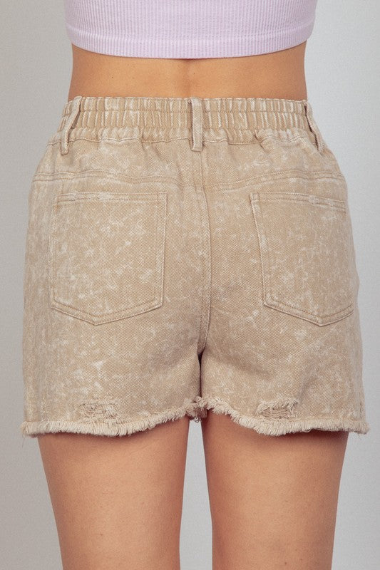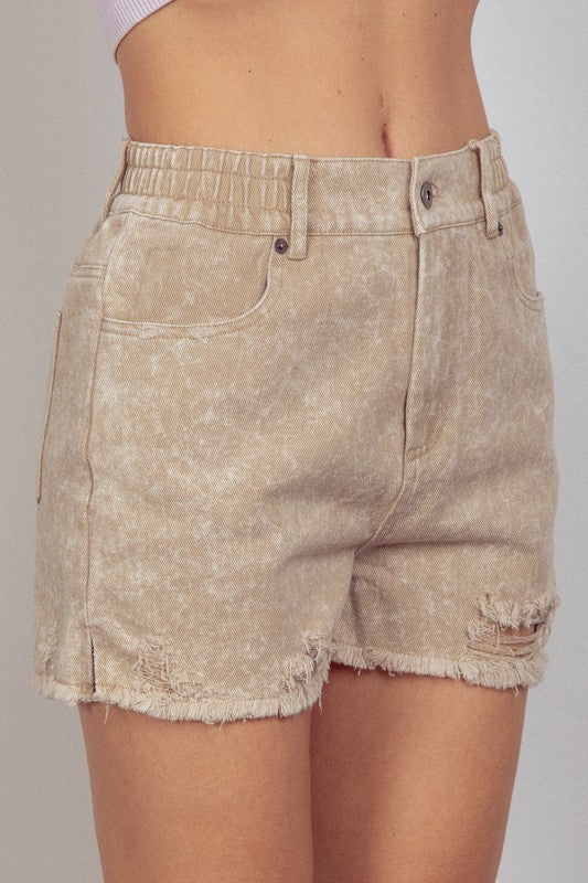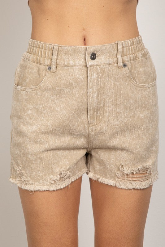 - Elastic High Waist Distressed Washed Frayed Denim Shorts