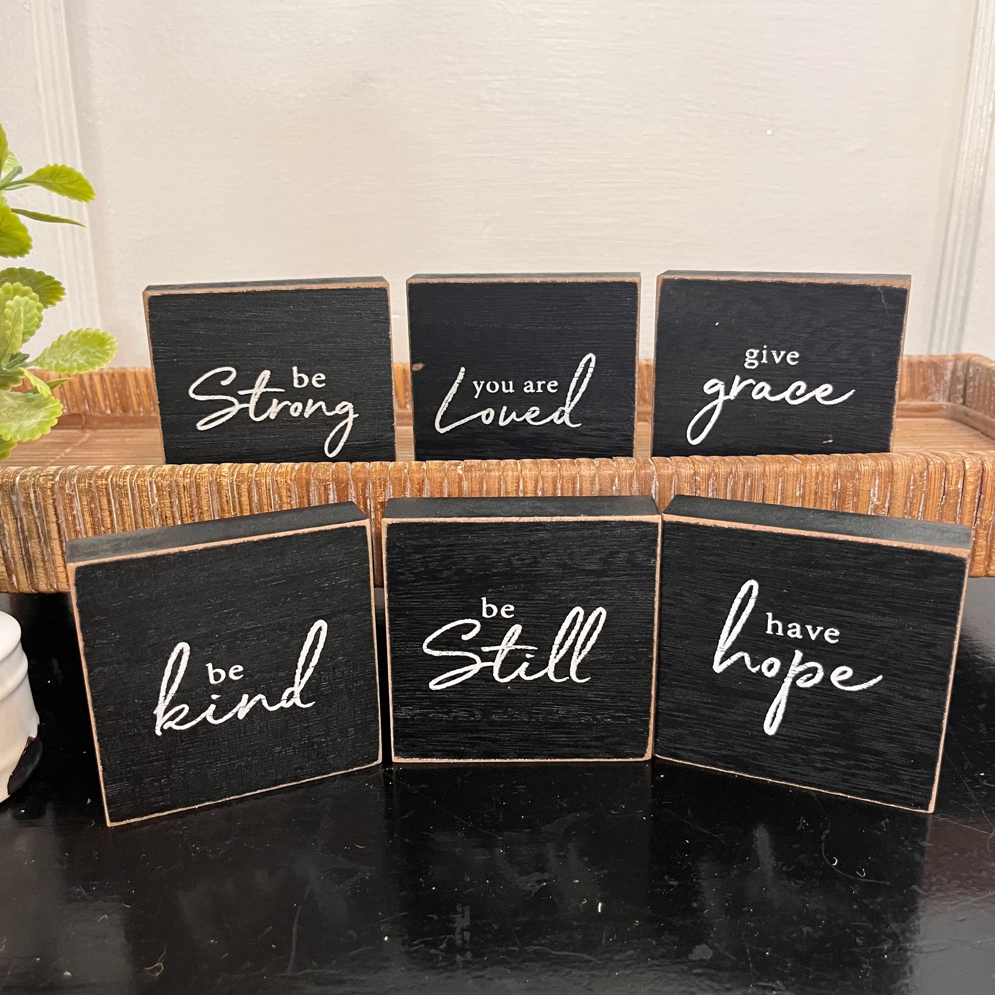 The Inspirational Hope Words Black Wooden Square Block assortment will add notes of inspiration throughout the farmhouse. These simple wooden blocks are freestanding and measure 3" square by .75" thick. They have short phrases in white script and text on a black background with lightly scuffed edges. The blocks read 'you are loved, 'be strong',' 'be kind,' 'give grace,' 'be still,' and 'have hope.' These blocks can easily accent a wide variety of styles and themes with their lovely but subtle style. They look great with a pop of colorful florals and natural textures like baskets or dried grass mats. Plus, they make an obvious pairing for classic black and white decor.