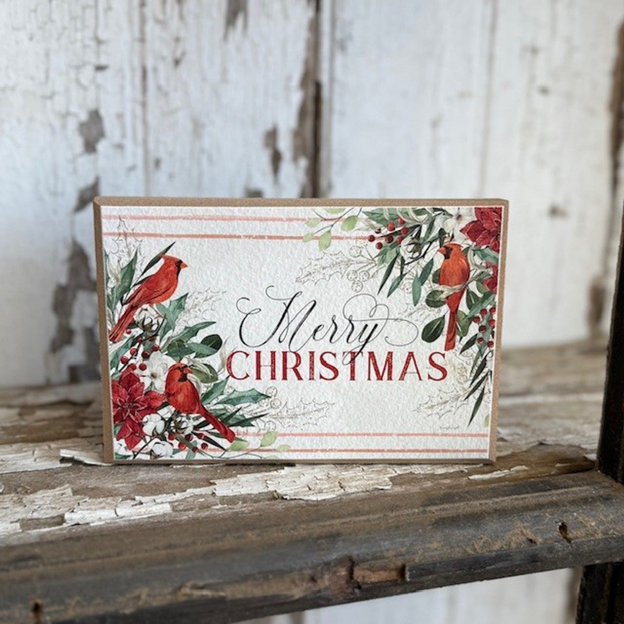 This block is called "Cardinal Merry Christmas". The block has a textured white background with white florals and red poinsettias in the top right corner, accented by a red cardinal and greenery. In the bottom opposite corner, the same florals are present, this time with two red cardinals. In the center, the words "Merry Christmas" are displayed, with “Christmas” in a bold red font. The design feels simple, yet festive and warm. The 6X4X1 size makes it perfect to display on table-top, shelf or mantle.