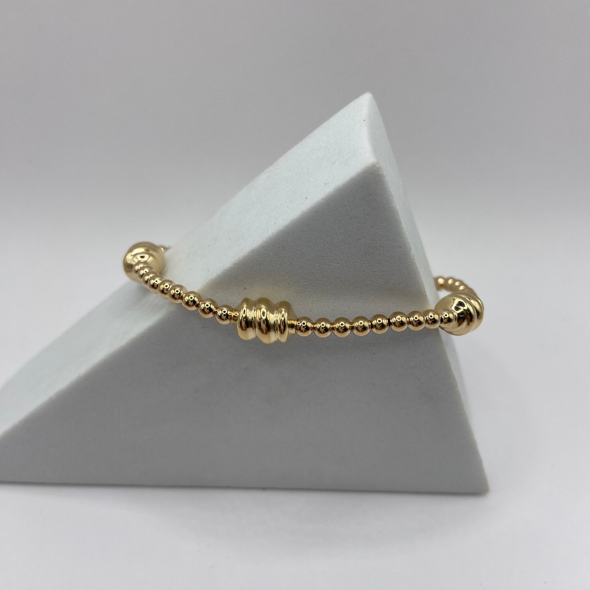 - Made with 3mm, 14kt gold-filled beads and 8mm admire gold