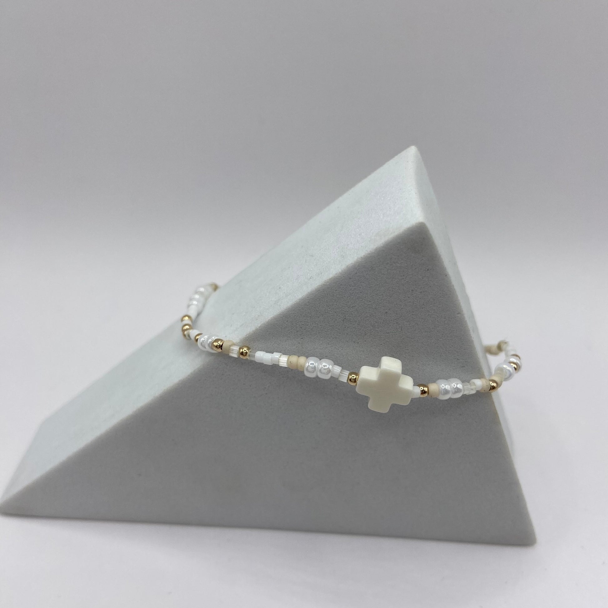 - Made with various colors of randomly mixed 2mm seed beads and 2mm 14k gold-filled beads with signature cross