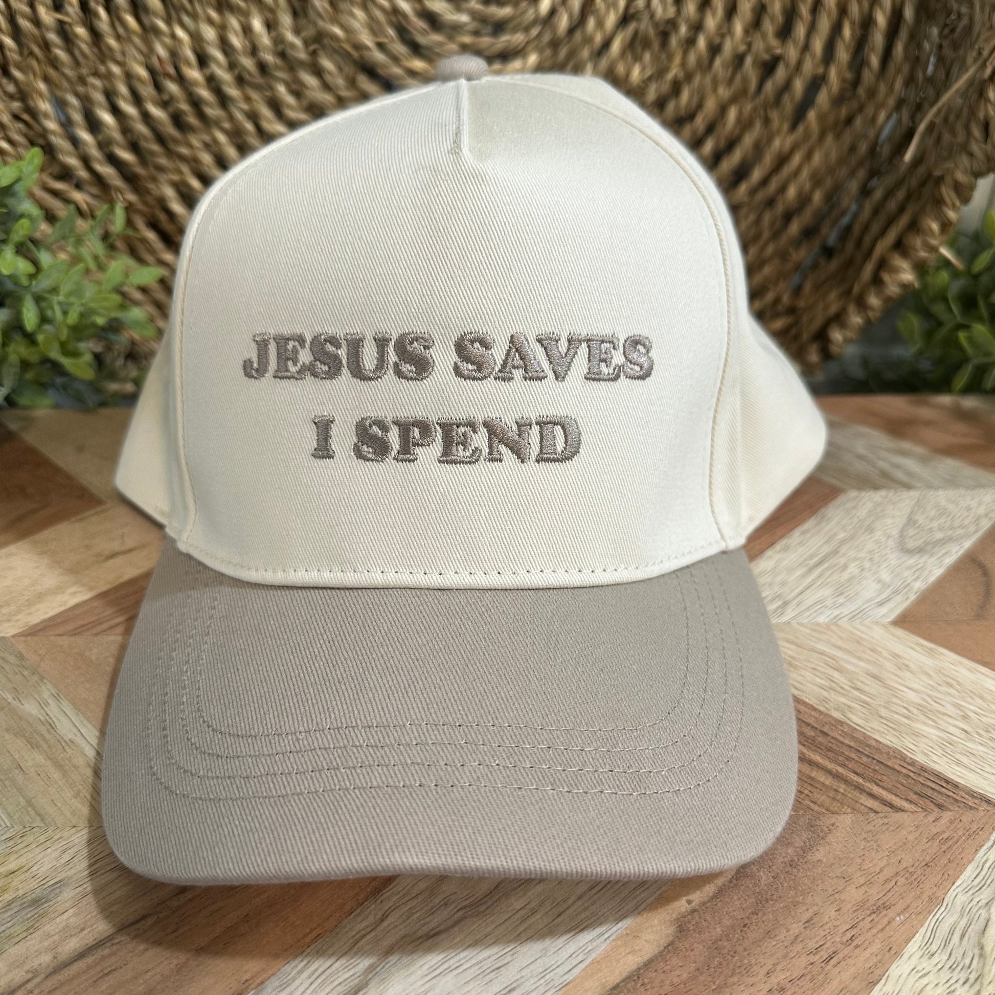 "JESUS SAVES I SPEND" Embroidered Two Tone Baseball Cap