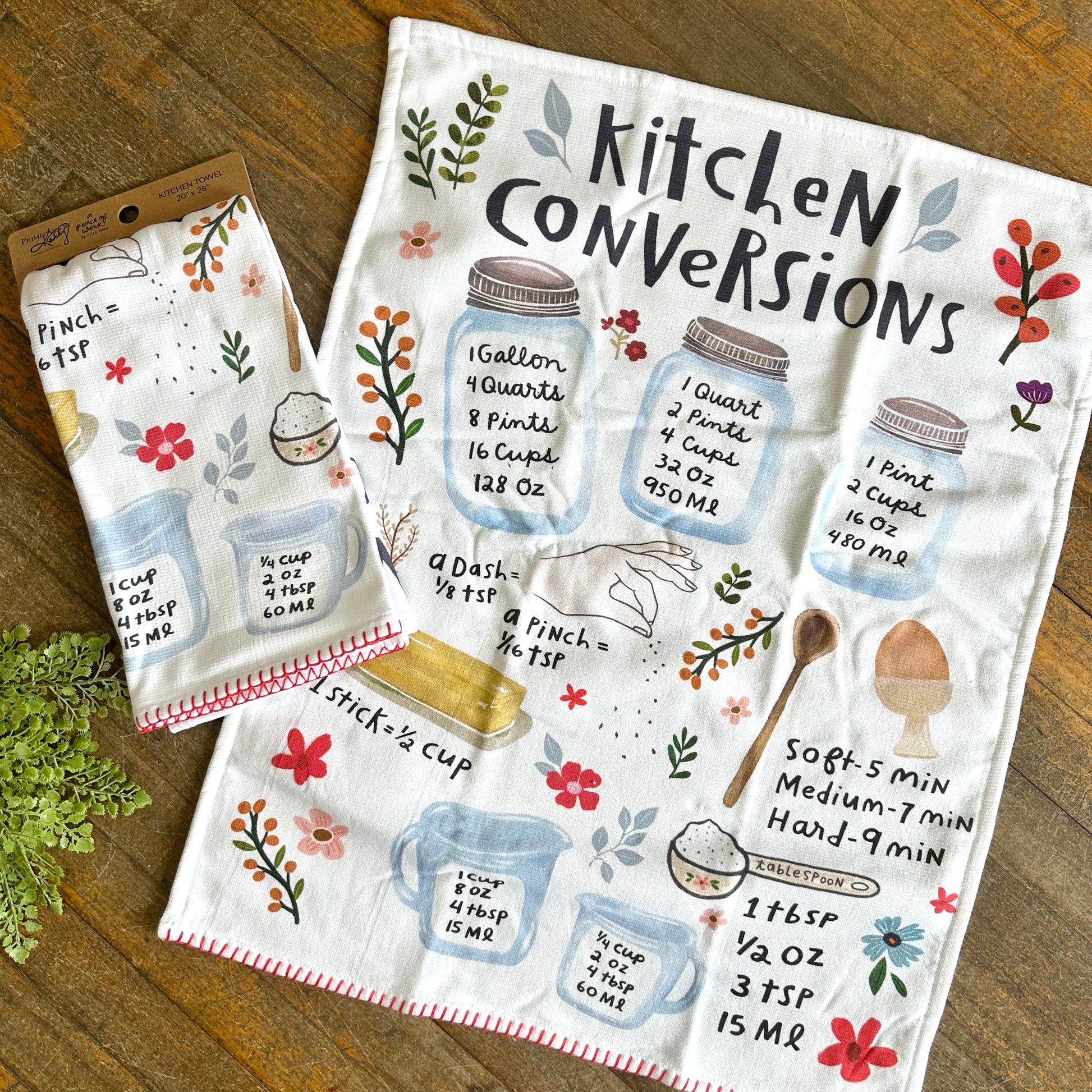A cotton kitchen towel displaying a fun kitchen conversion inspired all-over design replicated from original hand illustrated art. Homestead design features various measurement conversions and cooking instructions with coordinating illustrations. Kitchen conversion designs are printed on textured slub fabric with a coordinating red hem stitch at the bottom. Kitchen towel features a terrycloth layer on the back for added absorbency and corner loop for hanging. Our Kitchen Conversions kitchen towel is conveniently machine-washable for easy cleaning. A fun homestead-themed gift perfect for an everyday kitchen accessory.