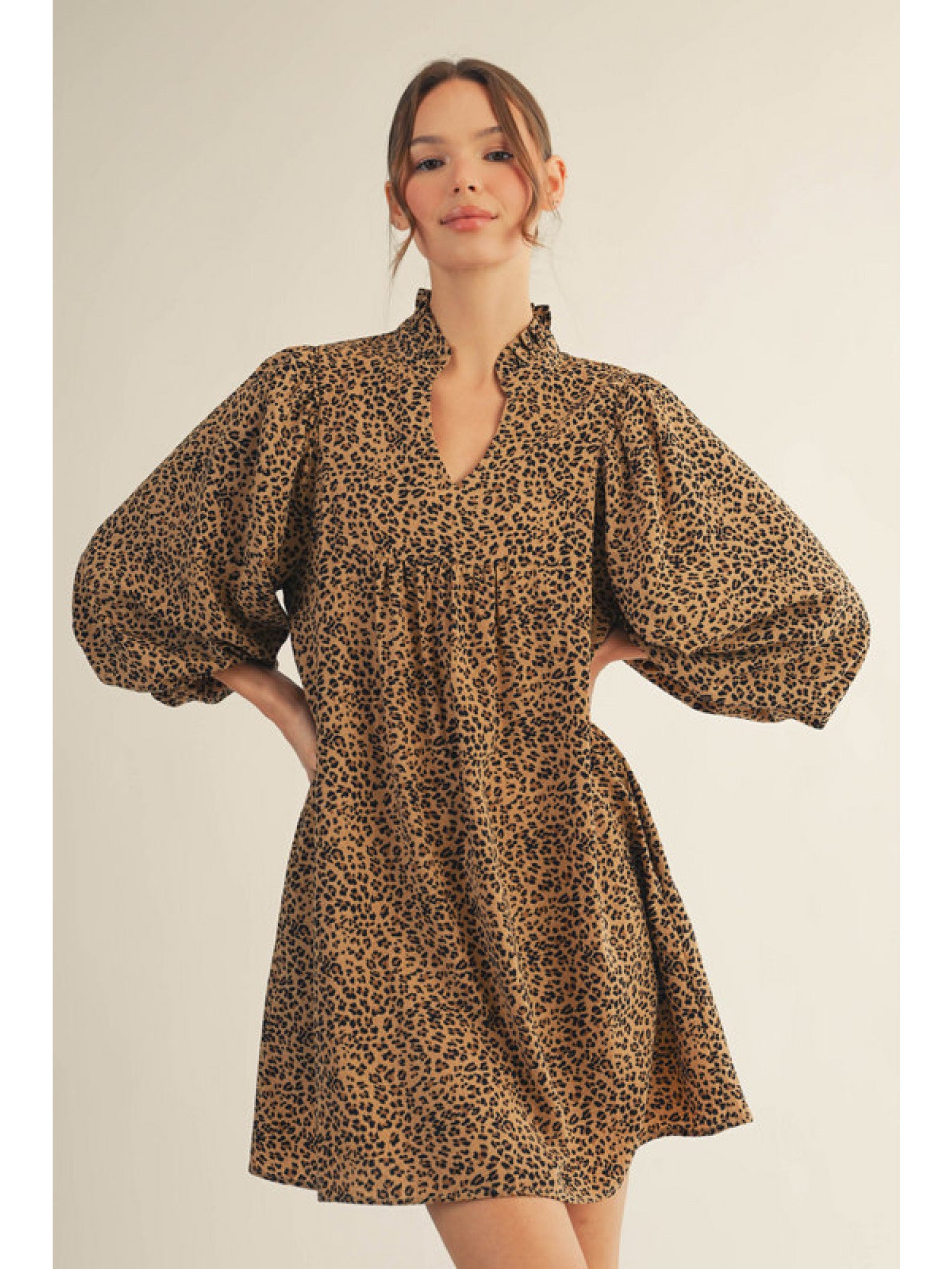 3/4 puff sleeves leopard babydoll dress with side pockets, ruffled neckline.