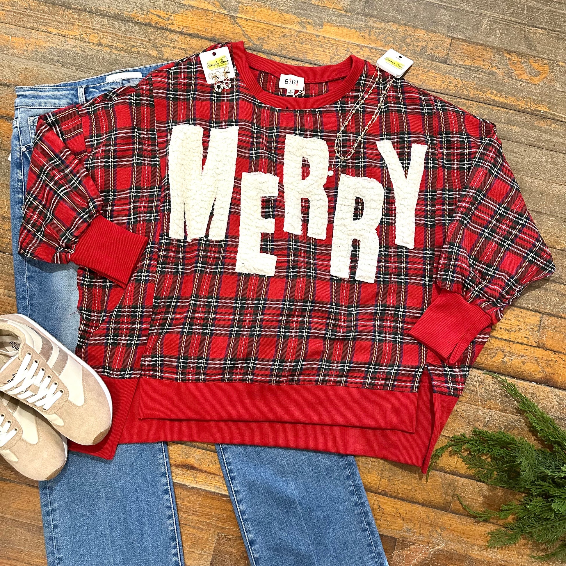 MERRY LETTER PATCHES CHRISTMAS PLAID CUT EDGE DETAIL OVERSIZED SWEATSHIRT