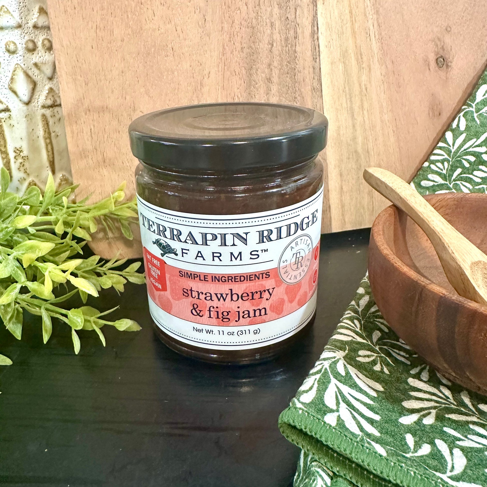 Figs and strawberries complement each other in this delicious gourmet jam, while a touch of orange zest gives this all natural jam complex flavor. Marvelous spread on brie or goat cheese. Scrumptious spooned on pork tenderloin as a finishing sauce.
