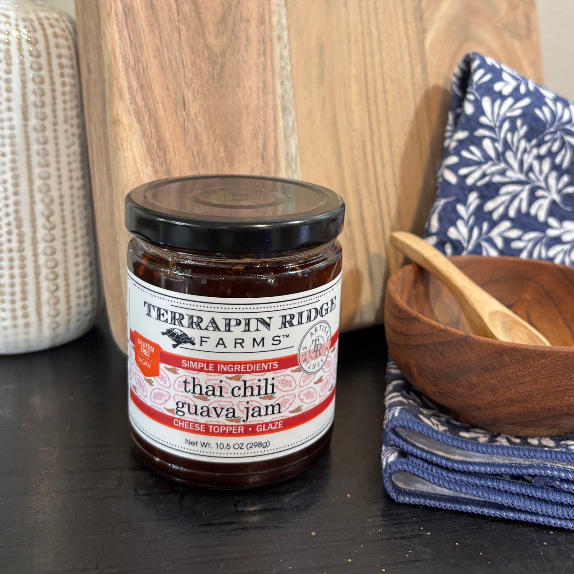 Experience the bold, sweet, and spicy fusion of flavors with our Thai Chili Guava Jam. This unique condiment brings together the tropical sweetness of guava with the warm, spicy kick of chili. Perfect as a topping for a cheese board, pairing beautifully with creamy brie, tangy goat cheese or sharp cheddar. Use as a glaze for grilled chicken, pork tenderloin, or shrimp to infuse each bite with a delightful balance of heat and sweetness. Spread on turkey, chicken, or veggie burgers for a sweet and spicy twist.