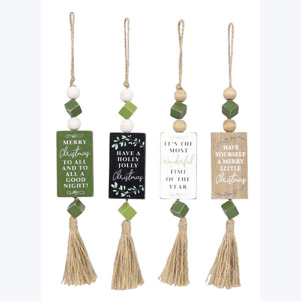 Add festive charm to your holiday décor with this set of four mini wooden wall signs. Each sign features a heartwarming holiday message, colorful bead accents, and a rustic jute tassel. Perfect for hanging on walls, trees, or adding a decorative touch to gifts.