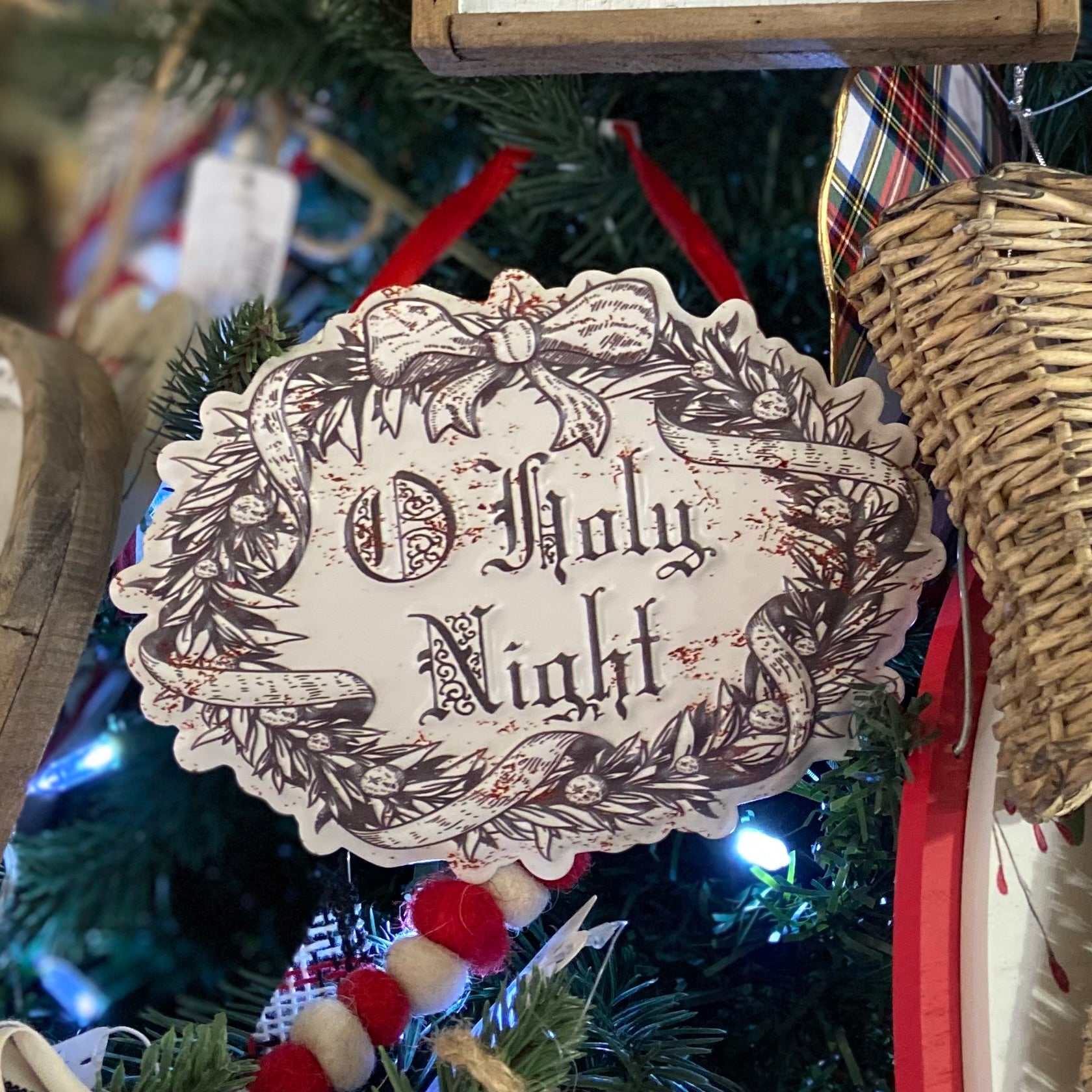 Displaying vintage Christmas designs with seasonal sentiments and embossed details as well as a rust finish for an aged appearance. Vintage ornaments display seasonal sentiments including "O Holy Night," "Merry Christmas," or "Noel." Our Vintage Christmas ornaments are easy to hang for display via attached red ribbon hangers.