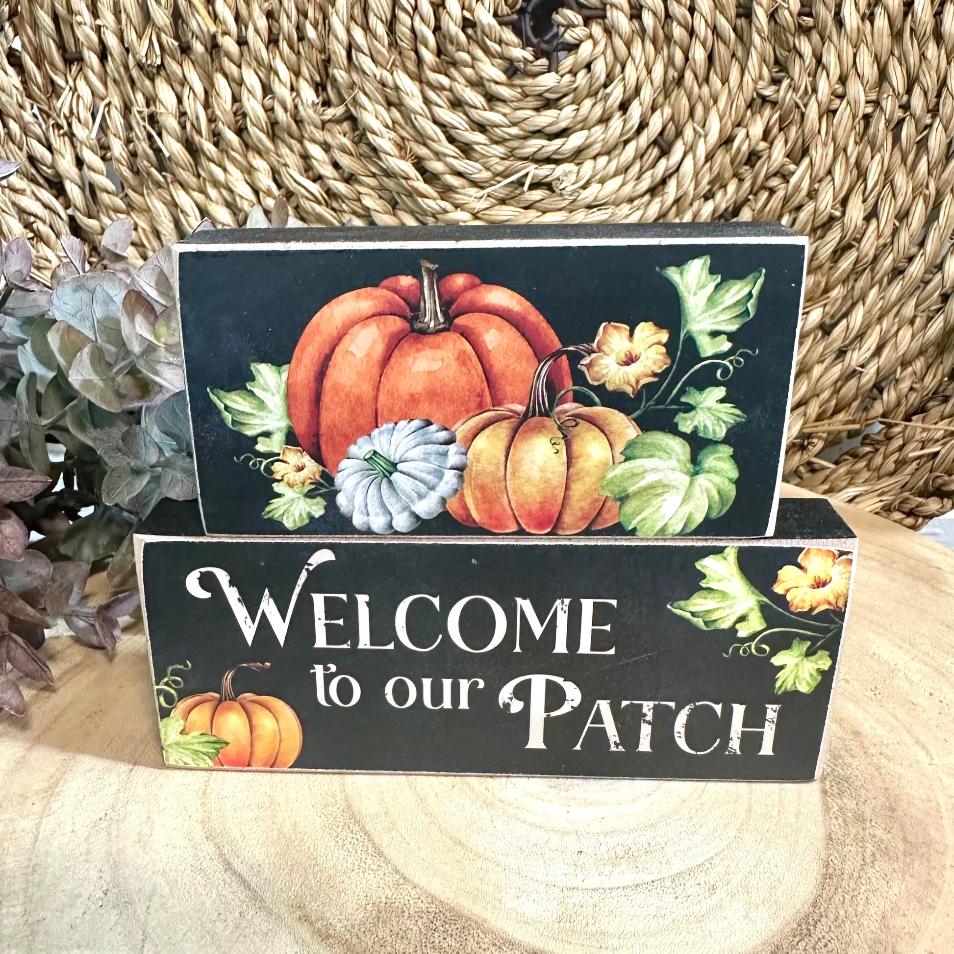 The 2-piece set Welcome to Our Patch Stacking Blocks show Fall pumpkins, gourds, and greenery on a black background for a fresh take on traditional harvest decor. Blocks have painted black sides and distressed edges. Measures 2" high by 5" or 4" across by 0.75" thick.