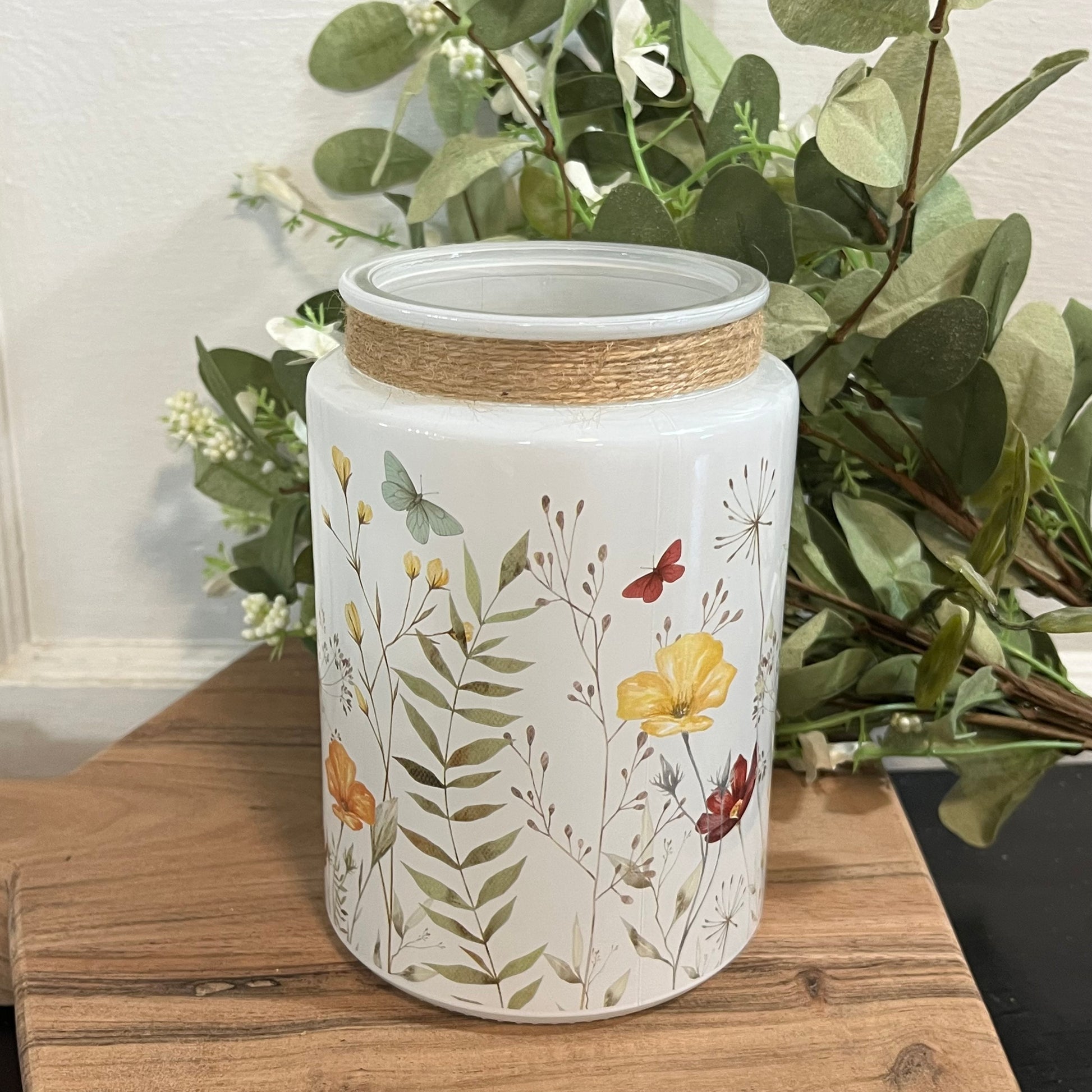 white ceramic jar with wildflower design