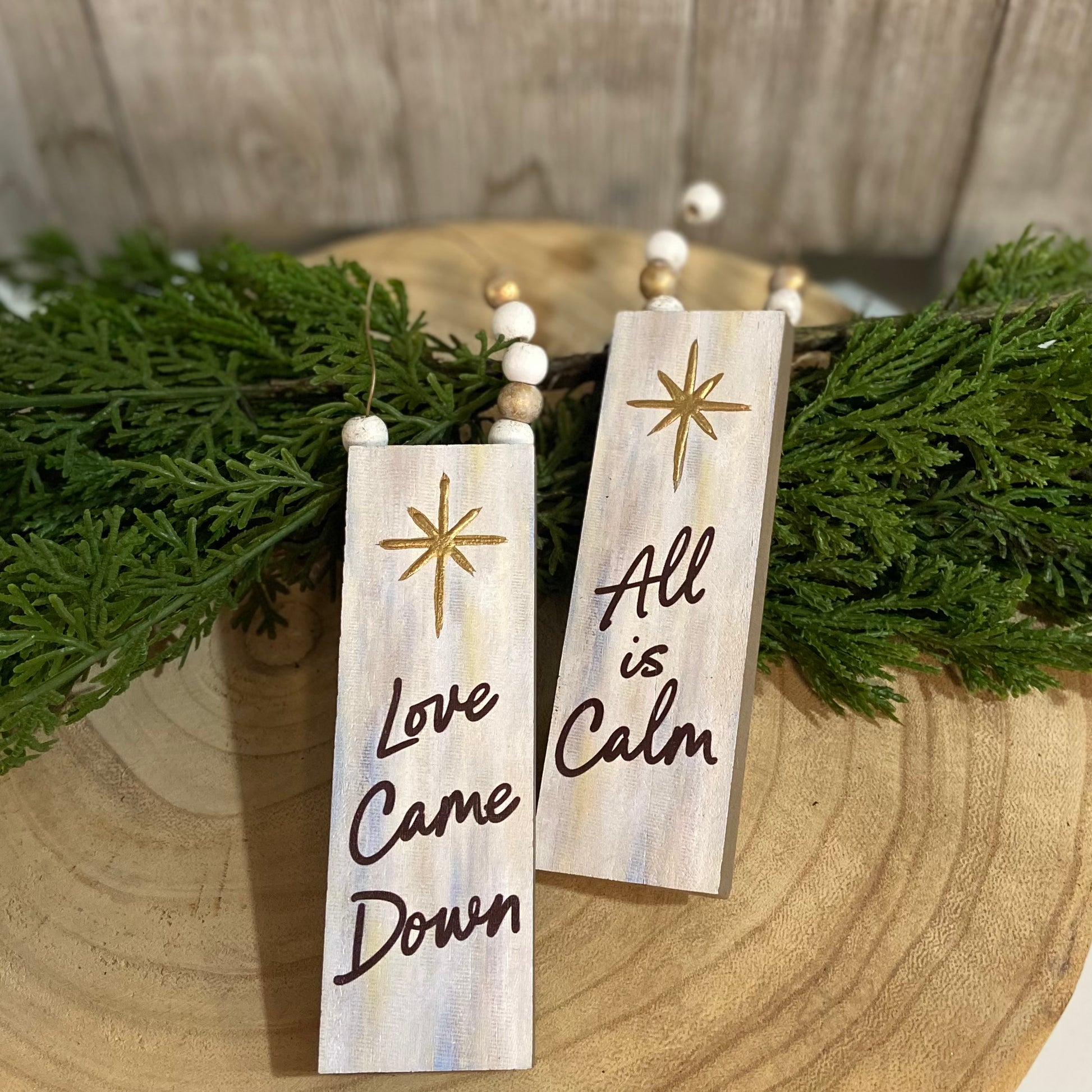 Wooden rectangular ornaments. "All is Calm", "Love Came Down", "Oh Holy Night", or "A Child is Born". Each ornament is a mixture of shades of cream and blue, with a gold metallic star. Wire hanger includes gold brushed beads.