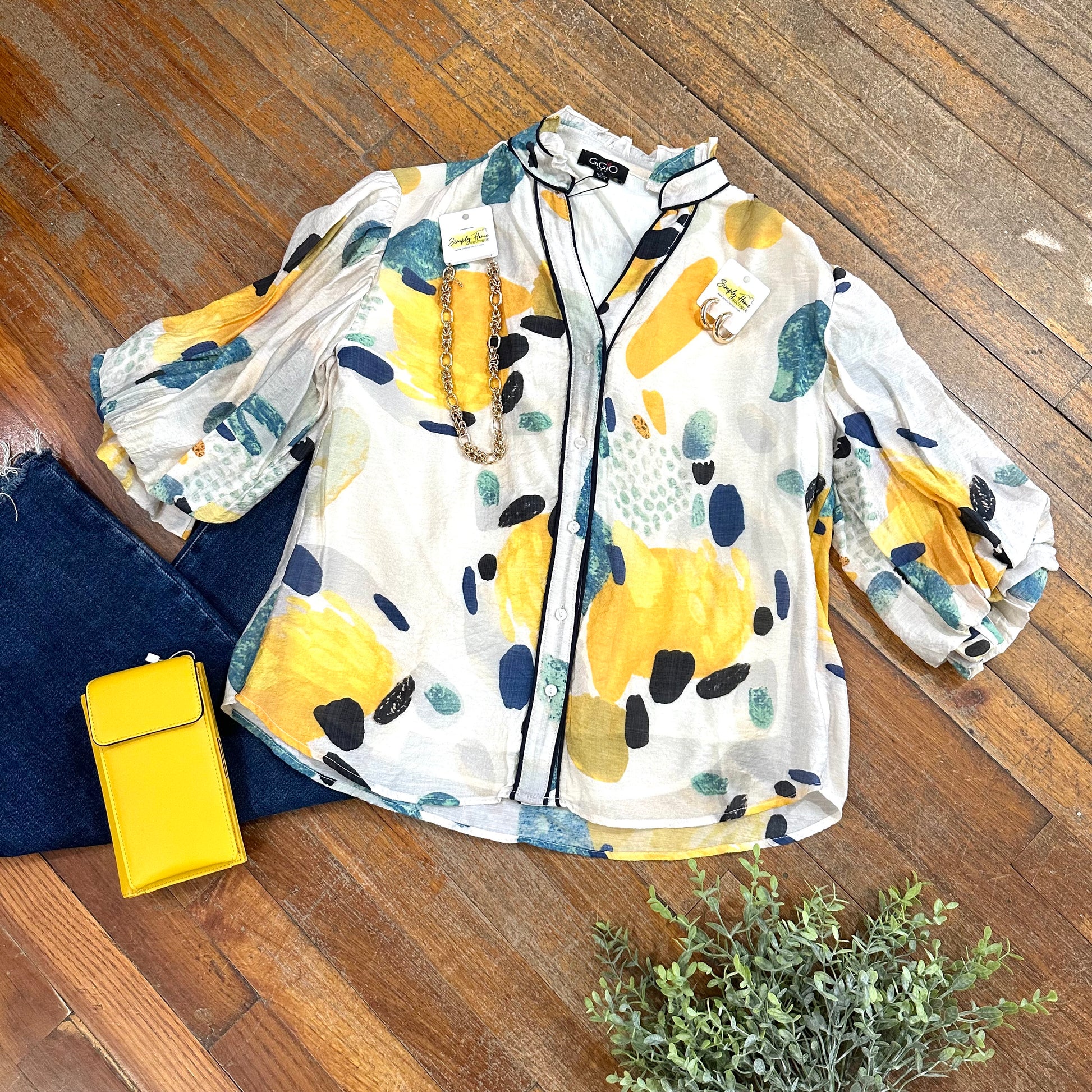 Printed Blouse with Piping Detail and Gathered Balloon Sleeves